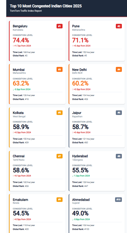 संदर्भ: टॉमटॉम ट्रैफिक इंडेक्स 2025 के अनुसार, भारत विश्व के शीर्ष सर्वाधिक यातायात संकुल देशों में शामिल है।