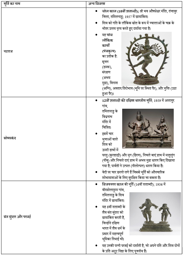 संदर्भ: संयुक्त राज्य अमेरिका स्थित स्मिथसोनियन के ‘नेशनल म्यूजियम ऑफ एशियन आर्ट’ ने नटराज, सोमस्कंद (शिव-पार्वती-स्कंद)  और संत सुंदरर व परवई की मूर्तियों को भारत सरकार को वापस करने का निर्णय लिया है। यह निर्णय इस बात की पुष्टि होने के बाद लिया गया है कि इन्हें तमिलनाडु के मंदिरों से गैर-कानूनी तरीके से हटाया गया था।
