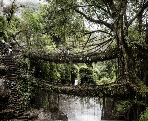 • लिविंग रूट ब्रिज का निर्माण नहीं किया जाता, बल्कि इन्हें नदियों और घाटियों के आर-पार फिकस इलास्टिका (Ficus elastica – रबर अंजीर के पेड़) की वायवीय जड़ों को प्रशिक्षित करके विकसित किया जाता है।