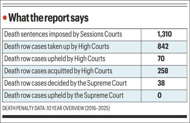 •  वर्ष 2016 से 2025 के बीच भारत भर में सत्र न्यायालयों ने 1,310 मृत्युदंड  दिए। अकेले वर्ष 2025 में ही 128 मृत्युदंड दिए गए।