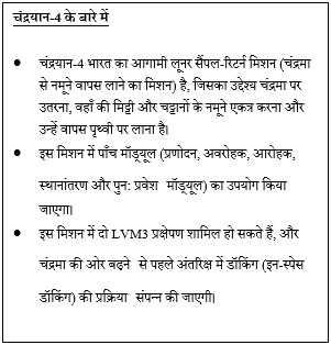 - केंद्रीय मंत्रिमंडल ने चंद्रयान-4 को भारत के पहले लूनर सैंपल रिटर्न मिशन (चंद्रमा से नमूने वापस लाने का मिशन) के रूप में मंजूरी दी है।