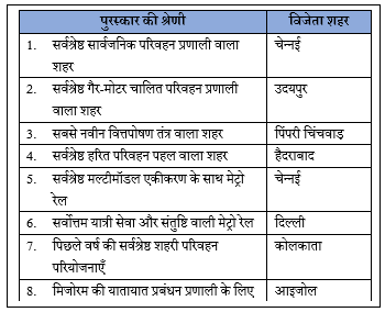 - तीन दिवसीय सम्मेलन का समापन शहरी परिवहन की 8 विभिन्न श्रेणियों में पुरस्कार वितरण के साथ हुआ।