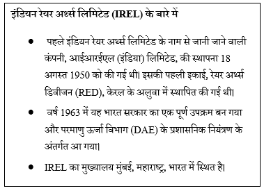 हाल ही में, परमाणु ऊर्जा विभाग के अधीन इंडियन रेयर अर्थ्स लिमिटेड (IREL) ने वित्त वर्ष 27 तक नियोडिमियम उत्पादन को 500 टन तक बढ़ाने की योजना की घोषणा की।