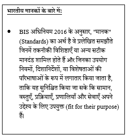 • एक न्य भारतीय मानक ब्यूरो अधिनियम, 2016 लाया गया जिसे 2017 में लागू किया गया था। इस अधिनियम के तहत BIS को भारत के राष्ट्रीय मानक निकाय के रूप में स्थापित किया।