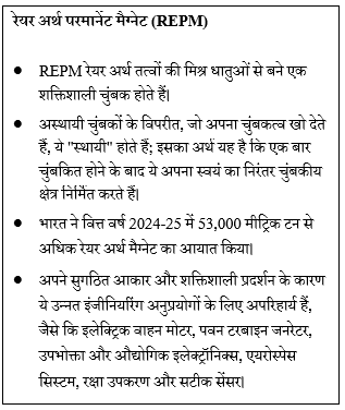 - भारत सरकार ने उच्च-प्रदर्शन वाले चुंबकों के लिए एक घरेलू एकीकृत पारिस्थितिकी तंत्र स्थापित करने हेतु नवंबर 2025 में “सिंटर्ड रेयर अर्थ परमानेंट मैग्नेट (REPM) के विनिर्माण को बढ़ावा देने की योजना” को मंजूरी दी थी।