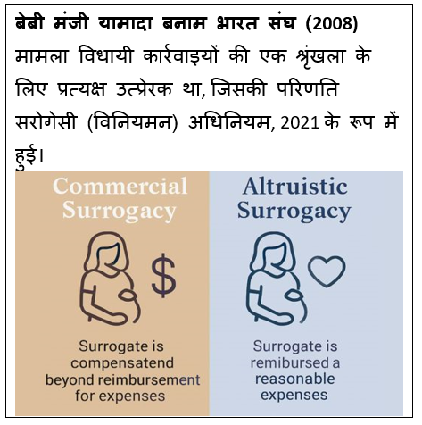 - यह अधिनियम केवल परोपकारी सरोगेसी की अनुमति देता है, तथा किसी भी व्यावसायिक सरोगेसी या मौद्रिक लाभ पर प्रतिबंध लगाता है।