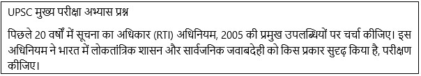 इस वर्ष सूचना का अधिकार (RTI) अधिनियम, 2005 के 20 वर्ष पूरे हो जाएंगे, इसलिए इसकी प्रभावशीलता और उपलब्धियों का आकलन करना महत्वपूर्ण है।