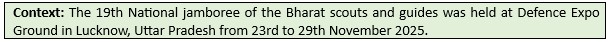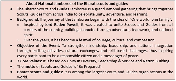 - Widespread participation: Around 33,000 Scouts, Guides, Rovers, and Rangers from various Indian states, along with over 1,500 youth delegates from the Asia-Pacific region, including the Maldives, Nepal, Sri Lanka, and Saudi Arabia, participated in the event.