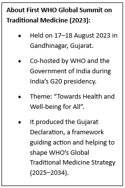- It underscores India’s growing leadership and pioneering initiatives in shaping a global, science-based and people-centred Traditional Medicine agenda.