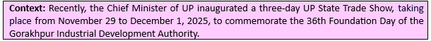 - The CM also laid the foundation stone for a flatted factory worth ₹34 crore in Lucknow and a Common Facility Centre for ODOP packaging costing ₹3.91 crore in Gorakhpur.