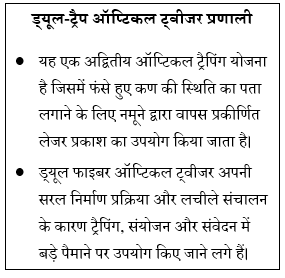 - उन्नत ड्यूल-ट्रैप ऑप्टिकल ट्वीजर (चिमटी) एकल जैव-अणुओं और छोटे कणों में हेरफेर करने के लिए अधिक परिशुद्ध एवं बहुमुखी उपकरण है।