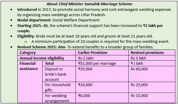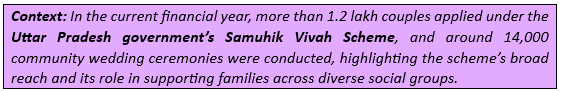 | Context: In the current financial year, more than 1.2 lakh couples applied under the Uttar Pradesh government’s Samuhik Vivah Scheme, and around 14,000 community wedding ceremonies were conducted, highlighting the scheme’s broad reach and its role in supporting families across diverse social groups. |