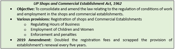 Context: Recently, the Uttar Pradesh Cabinet cleared a proposal to extend the scope of the UP Shops and Commercial Establishment Act, 1962, to cover any establishment employing 20 or more workers such as medical clinics, tax consultants, architects etc.