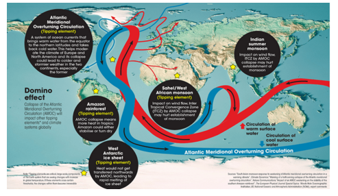 • Threshold Behaviour: AMOC is one of the 16 climate tipping elements that could undergo abrupt, irreversible changes with widespread cascading impacts.