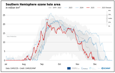 - The 2025 ozone hole was relatively small for the second consecutive year when compared to the large and long-lasting ozone holes observed from 2020 to 2023.