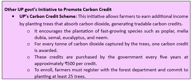 Carbon Credit Mechanism: Farmers will earn carbon credits for reducing carbon emissions because trees planted by them on their land absorb carbon dioxide from the atmosphere continuously for photosynthesis.