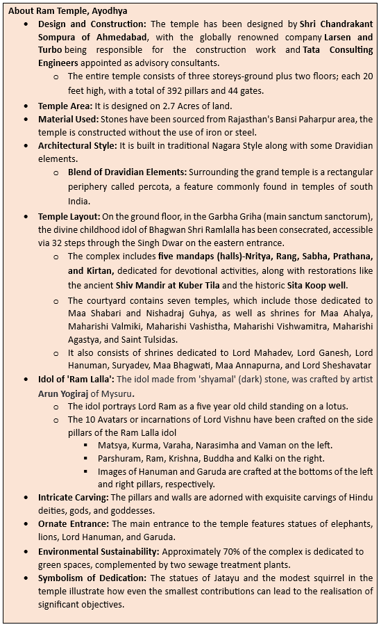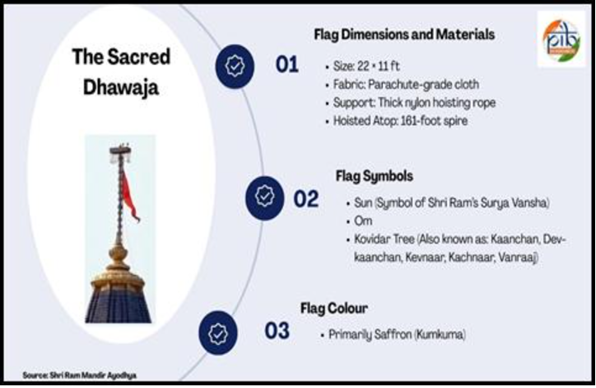 - Significance: The flag bears the image of a radiant sun symbolising Lord Ram’s valour, an ‘Om’ symbol, and the Kovidara tree.