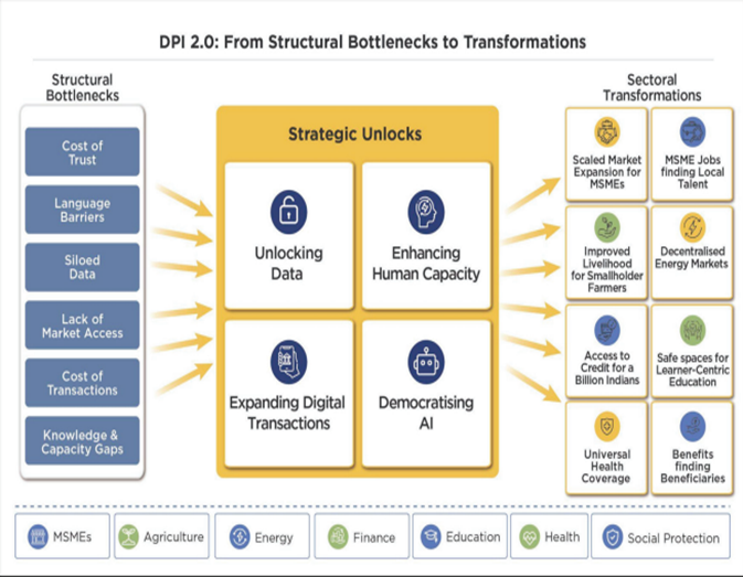 - DPI 2.0 समाज के सभी वर्गों के लिए ज्ञान, बाजार और अवसरों के उपयोग को लोकतांत्रिक बनाने के लिए कृत्रिम बुद्धिमत्ता (AI), विश्वसनीय डेटा प्रणाली और अंतर-संचालनीय डिजिटल बुनियादी ढांचे को एकीकृत करता है।
