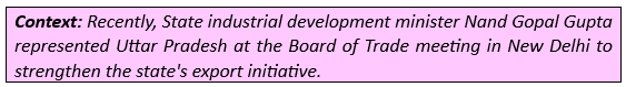 | Context: Recently, State industrial development minister Nand Gopal Gupta represented Uttar Pradesh at the Board of Trade meeting in New Delhi to strengthen the state’s export initiative. |