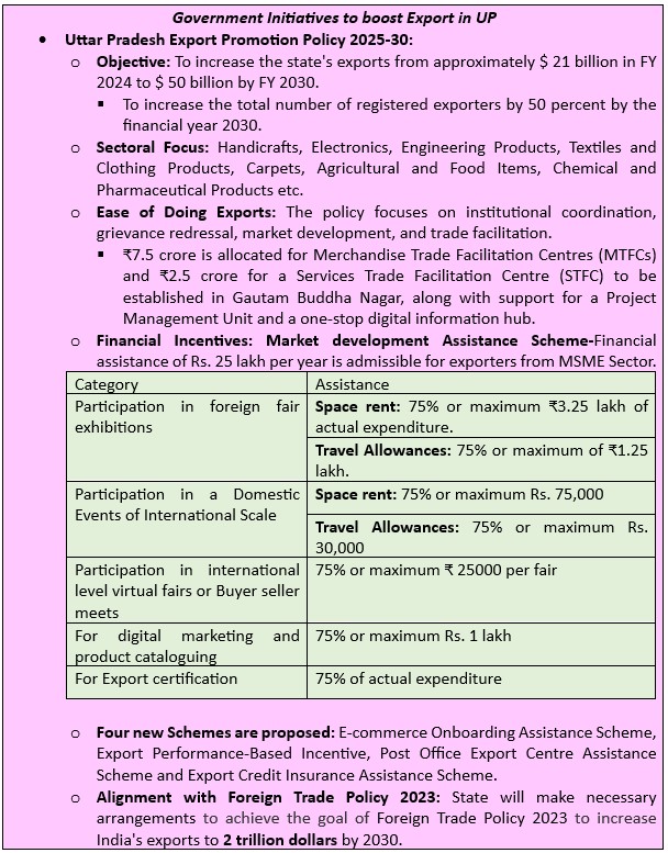 - To drive future growth, the state has rolled out its UP Export Policy 2025–30, a comprehensive set of reforms and incentives aimed at significantly increasing Uttar Pradesh’s share in India’s total exports.