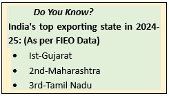 - State Ranking: According to FIEO (Federation of Indian Export Organisations), Uttar Pradesh contributed ₹1.86 lakh crore to India’s total exports of ₹37.02 lakh crore in 2024-25, ranking fifth among the top exporting states.