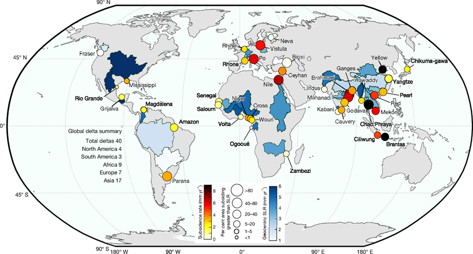 - Large Deltas Drive Most Land Subsidence: Seven major deltas such as Ganga-Brahmaputra, Nile, Mekong, Yangtze, Amazon, Irrawaddy and Mississippi, account for about 57 % of the total subsiding delta area worldwide.