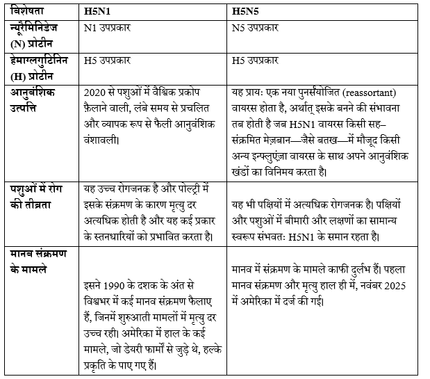 - स्वास्थ्य अधिकारियों ने पुष्टि की है कि H5N5 स्ट्रेन, पोल्ट्री में महामारी फैलाने वाले व्यापक रूप से प्रचलित H5N1 स्ट्रेन से अलग है।