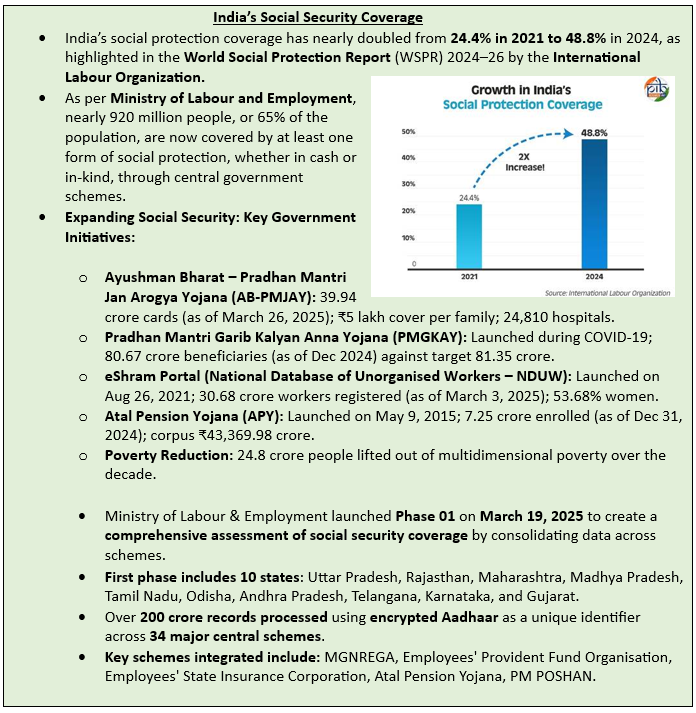 Context: A recent report released by the International Labour Organization (ILO), “Universal Social Protection in Changing Labour Markets: Protecting Workers in All Types of Employment highlights the urgent need to strengthen social protection systems in response to changing labour market realities, including informalisation, gig work, and non-standard employment.