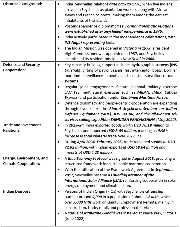 - The visit coincided with 50 years of Seychelles’ Independence and 50 years of India–Seychelles diplomatic relations.