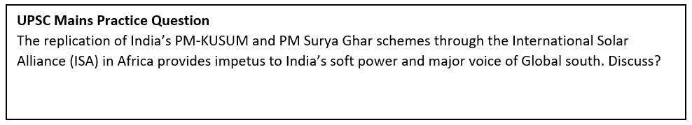 Recently, The Union Ministry of New and Renewable Energy announced plans to replicate the PM-KUSUM and PM Surya Ghar schemes in Africa and island nations through the International Solar Alliance (ISA) to promote clean energy.
