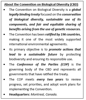 • The report is India’s official submission under the CBD, an international treaty through which countries commit to conserving biodiversity and using natural resources sustainably.