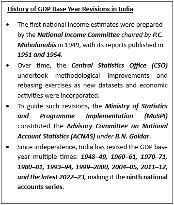 Context: Recently, the Ministry of Statistics and Programme Implementation (MoSPI) has released a new GDP series with a base year of 2022–23, replacing the earlier 2011–12 series, along with methodological and data improvements to better reflect India’s evolving economic structure.