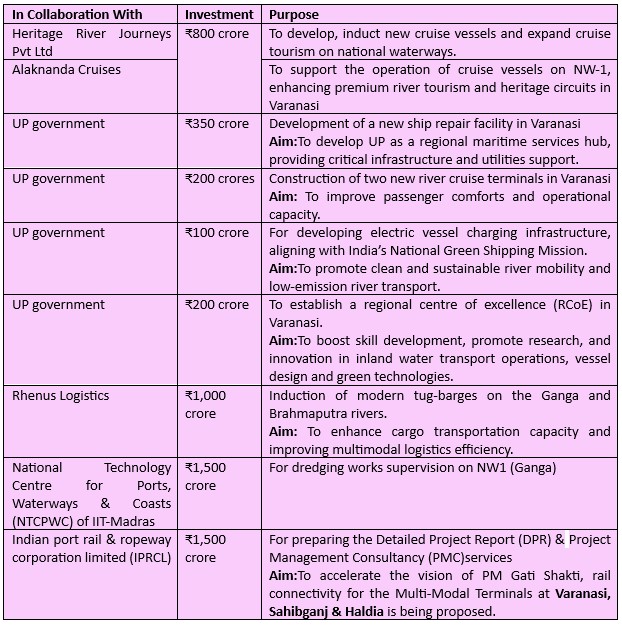 - Aim: To strengthen river cruise tourism, ship repair infrastructure, multimodal connectivity and clean-energy transportation along National Waterway-1 (Ganga).