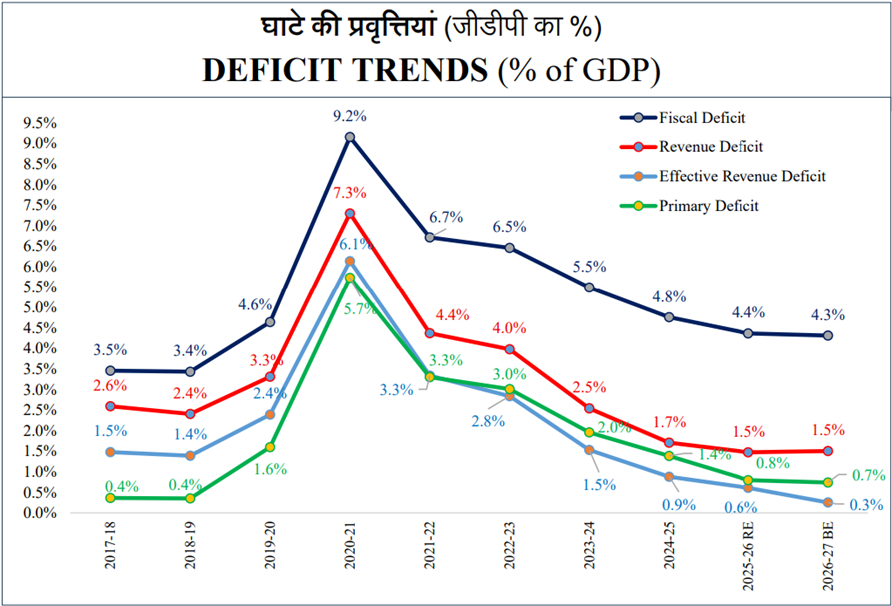- Fiscal deficit in 2026-27 is targeted at 4.3% of GDP, which is lower than the revised estimate of 4.4% of GDP in 2025-26.