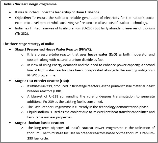• India is also shifting toward Light Water Reactors (LWRs) alongside Pressurised Heavy Water Reactors (PHWRs) to meet this target and enhance export competitiveness.