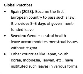 - Several Private Member’s Bills have been introduced in Parliament to institutionalize menstrual leave and improve menstrual hygiene, but none of them has become law.