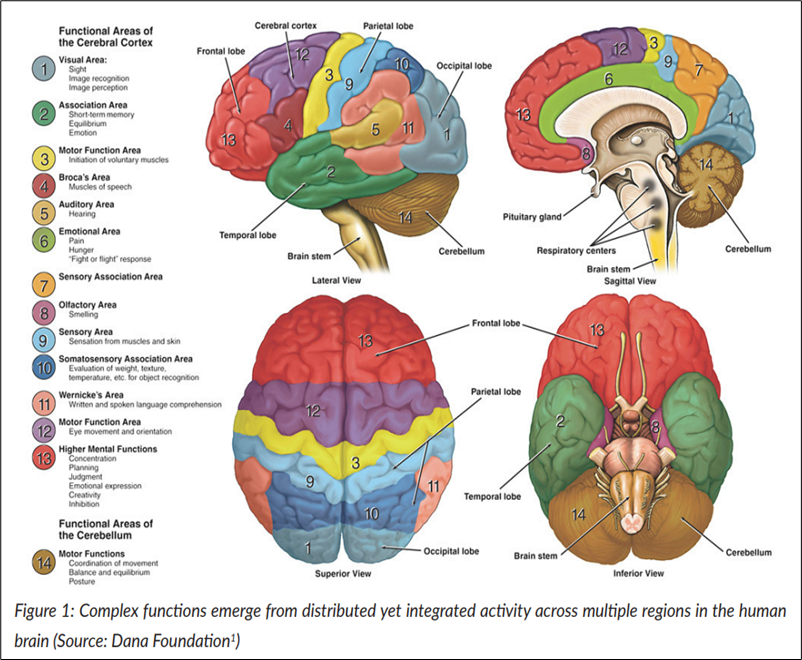 - Complex functions emerge from integrated activity across multiple brain regions rather than from a single isolated area.