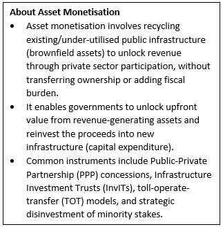 • Catalysing Infrastructure Financing: Enables recycling of capital from mature brownfield assets into new greenfield infrastructure projects, reducing fiscal pressure while sustaining high public capital expenditure.