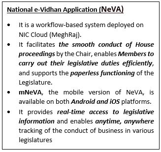 Context: Recently, the Ministry of Parliamentary Affairs concluded the 3rd National Conference on the National e-Vidhan Application (NeVA) in New Delhi to accelerate the shift toward digital and paperless legislatures.