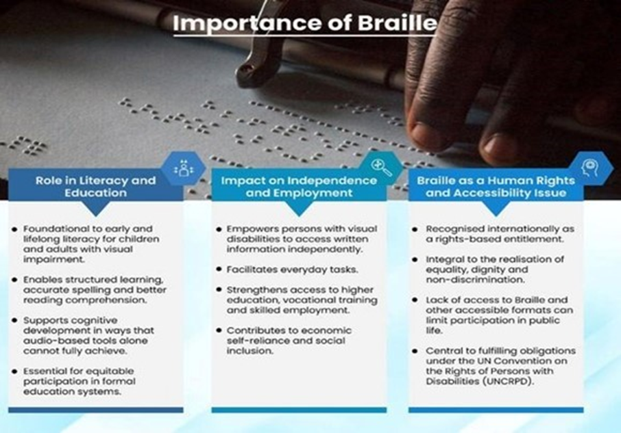 - The Government of India has developed a comprehensive, rights-based ecosystem to promote Braille for the inclusion and empowerment of persons with visual impairment.