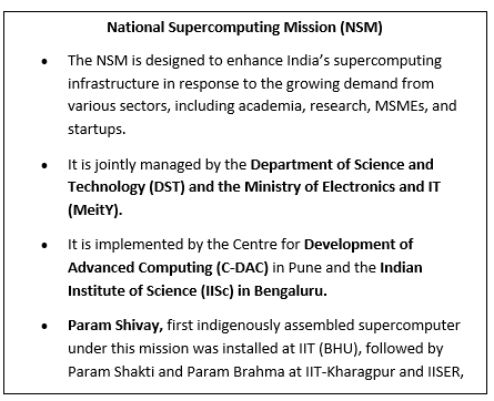• Under the NSM, Param Shakti hosts the Param Rudra supercomputing cluster with facilities for continuous power, efficient cooling, and data centre operations.