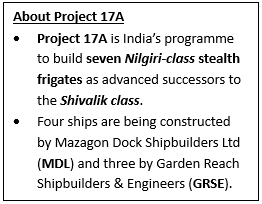 • It is the fifth ship of Nilgiri Class under the Project 17A and the second of the class built at Garden Reach Shipbuilding and Engineers Ltd (GRSE), Kolkata.