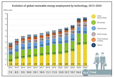 - Solar photovoltaics (PV) remained the largest renewable energy employer, driven by rapid growth in installations and panel manufacturing, with 7.3 million jobs in 2024.