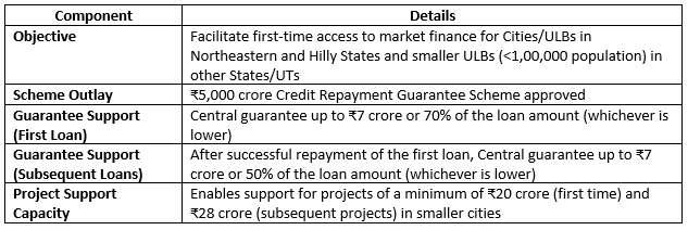 - A dedicated ₹5,000 crore corpus will enhance the creditworthiness of 4223 cities, including Tier- II and Tier-III cities, particularly for first-time access to market finance.