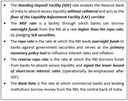 • The Standing Deposit Facility (SDF) rate remains at 5%, while the Marginal Standing Facility (MSF) rate and the Bank Rate continue at 5.5%, keeping the liquidity corridor unchanged.
