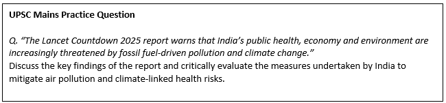 Context: Recently, the Lancet Countdown 2025 report by The Lancet highlights rising health, economic and environmental risks in India due to fossil fuel-driven pollution and climate change.