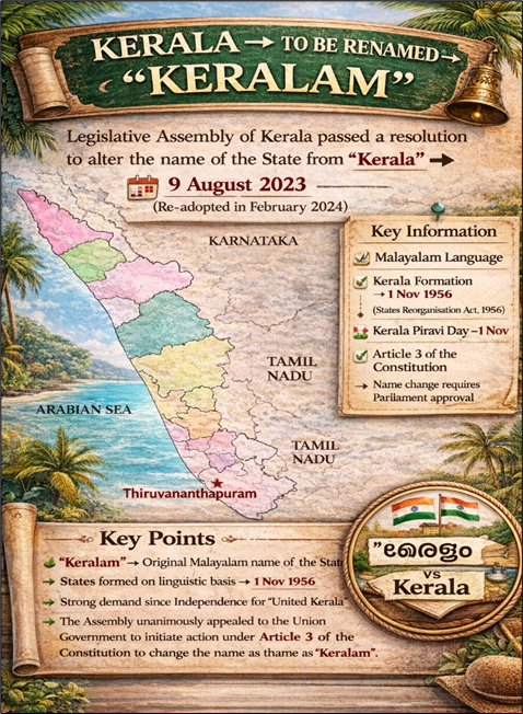 • After approval of the Union Cabinet, the President of India will refer a Bill, namely the Kerala (Alteration of Name) Bill, 2026 to the State Legislative Assembly of Kerala for expressing its views under the proviso to Article 3 of the Constitution of India.