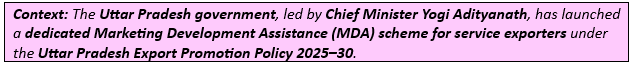 • With this move, Uttar Pradesh has become the first state in India to introduce a specialised marketing assistance policy exclusively for service exports, according to the state government.