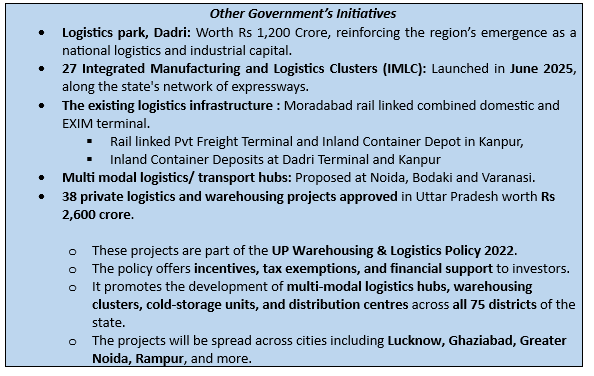 - Investment Potential: It is also expected to attract major domestic and global investors, logistics technology providers, and warehousing operators, positioning Uttar Pradesh as a pivotal player in India’s trade corridor network.