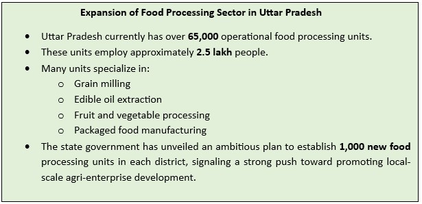 Context: : The Uttar Pradesh government is preparing to approve 12 new major food processing projects, attracting an estimated investment of ₹250 crore to boost the state’s agro-industrial sector.